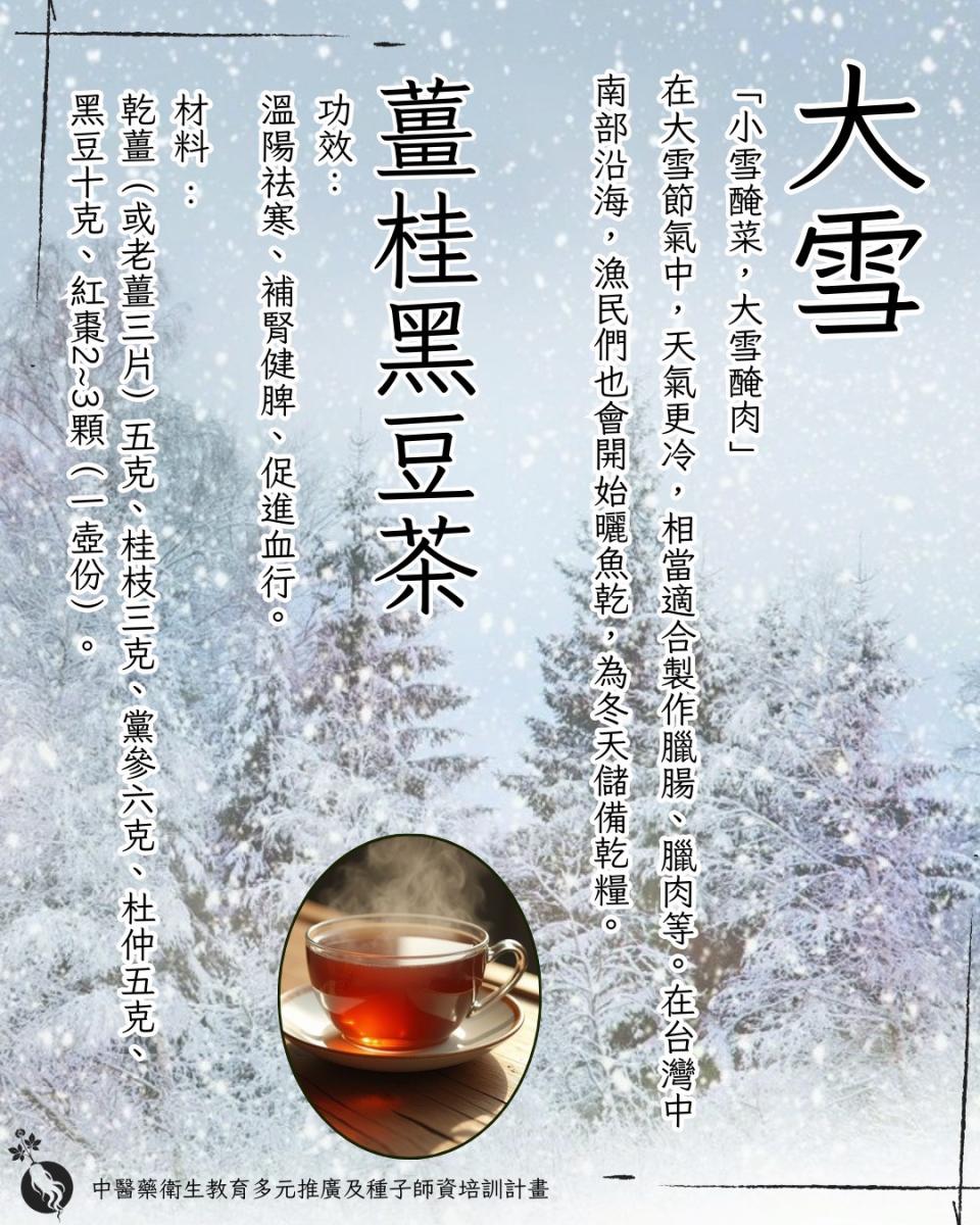 今年大雪入節點是12月7日上午5:04,農曆為十月十八,所以稱為十月大雪。比往年大雪交節在十一月份還來得早,因此就有俗語說:「早大雪凍死牛,晚大雪穿單衣」。今年大雪又逢雙 (農曆十月十八的雙數日期),就有:「大雪逢單一身乾,大雪逢雙雪堵門」的說法。依照上述先人的經驗,今年的雨雪可能會比較多,也比往年更冷。