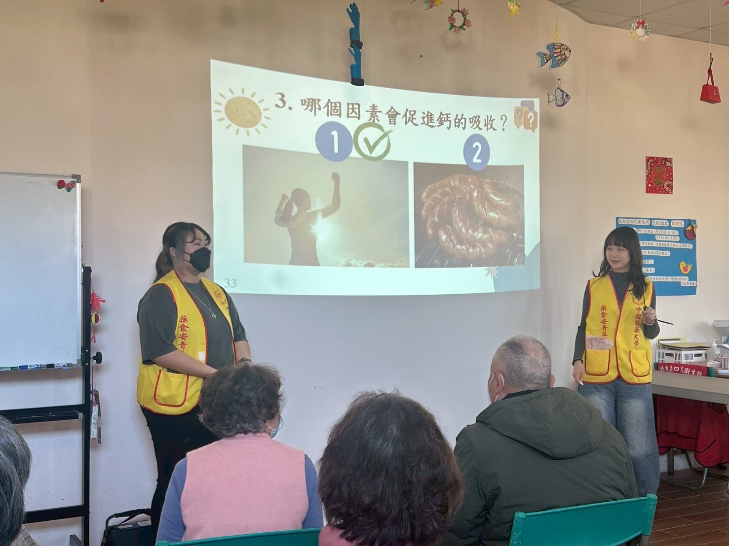 本次活動以「骨本顧得牢──鈣質攝取與乳製品食安觀念」為主題,由 徐國強教授指導,結合營養學與食品安全觀點,向社區民眾說明鈣質在骨骼健康中的重要性,以及乳製品選擇與食用時應注意之食品安全議題。活動內容包含鈣質攝取來源介紹、不同乳製品之營養差異比較、標示判讀重點說明,並針對常見迷思進行澄清,協助民眾建立正確且可實踐的飲食觀念。