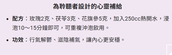 玫瑰在中藥裡有疏肝解鬱,活血化瘀效果,能紓緩心情鬱悶糾結;花旗參屬於涼補,能夠補氣養陰,有助身體恢復疲勞;雪白的茯苓是民間常用藥材,也是四神湯裡重要的一味,而茯苓則補益心脾,寧心安神,能讓整日聆聽他人憂苦的INFJ人,可以平衡情緒,減輕壓力和焦慮,再度把重心拉回自己身上。