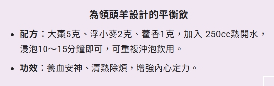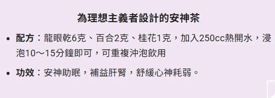 「他們因為不斷動腦,常有失眠及精神耗弱問題,」張文德解釋,INFP人較易出現「陰虛耗損」,也就是過度消耗身體的水分津液,造成陰虛有熱,氣鬱的問題多,建議可用滋陰降火的安神茶飲來緩解。