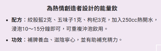 「ENFP人思慮過度,較偏向氣虛體質。由於他們情緒多變,容易焦躁不安及疲勞,很適合補益肝腎,以及抗氧化能力較強的藥草茶飲,來幫助他們舒緩疲勞、緊張壓力,」張文德說。