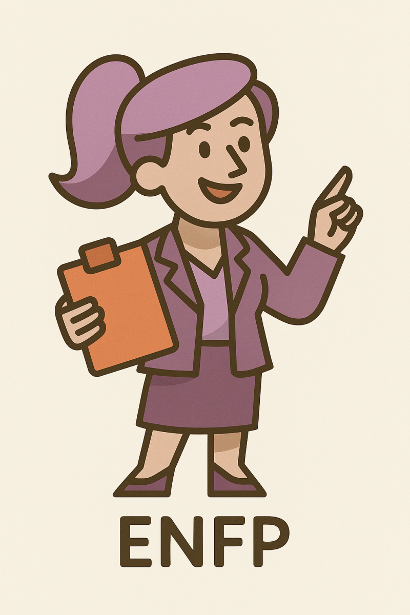 ENFP人是個充滿熱情的點子王,精力旺盛愛冒險,喜歡與人溝通,腦筋動得快,像是記者、競選者及企劃人員多屬此類。因為工作型態快速,樣樣事情必須趕時間,導致ENFP人較無法集中注意力,有時會比較情緒化。